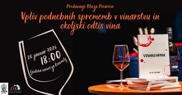 Vabljeni na predavanje Vpliv podnebnih sprememb v vinarstvu in okoljski odtis vina, ki bo v sredo, 28. januarja 2026, ob 18.uri v prostorih Ljudske univerze Črnomelj, Kolodvorska 32c, Črnomelj.